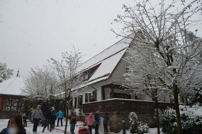 Deshalb gingen wir zur Morgenrunde spontan nach draußen hinter das Haus um den unberührten Schnee zu betrachten, um die Natur so kennenzulernen wie man sie zuhause in Duisburg wohl nur selten sieht. Auf dem Rückweg ins Haus konnten dann einige nicht mehr an sich halten und die ersten Schneebälle flogen in Richtung anderer Kinder.